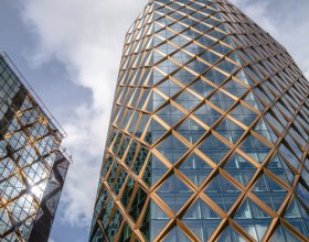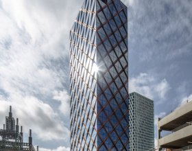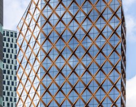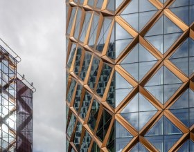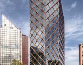 Charakteristický vzhled fasády vznikl díky více než tisícovce prvků (na ploše 8 700 m²) z tepelně tvrzeného skla s protisluneční ochranou Stopray Vision-52Tv kombinaci s hliníkovými profily. Jednotlivé prvky jsou tvořeny největšími dostupnými plochými skleněnými tabulemi jumbo (3,20 x 6,00 m), rozdělenými do šesti trojúhelníků z důvodu minimalizace odpadu s tím, že v každém patře je takových jednopatrových skleněných trojúhelníků přibližně sto. Skleněné tabule jsou ukotveny na místě unikátním systémem hliníkových profilů, které jsou nejsilnější v místě křížení s půlmetrovým přesahem. Tloušťka v těchto místech křížení byla pečlivě vypočítána tak, aby napomohla snížení tepelné zátěže od slunečních paprsků, vytvořila rovnováhu mezi průhlednými a neprůhlednými částmi fasády a zajistila dostatečný průnik přirozeného světla do kanceláří a hotelových pokojů.